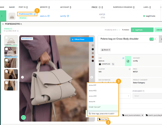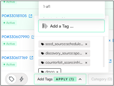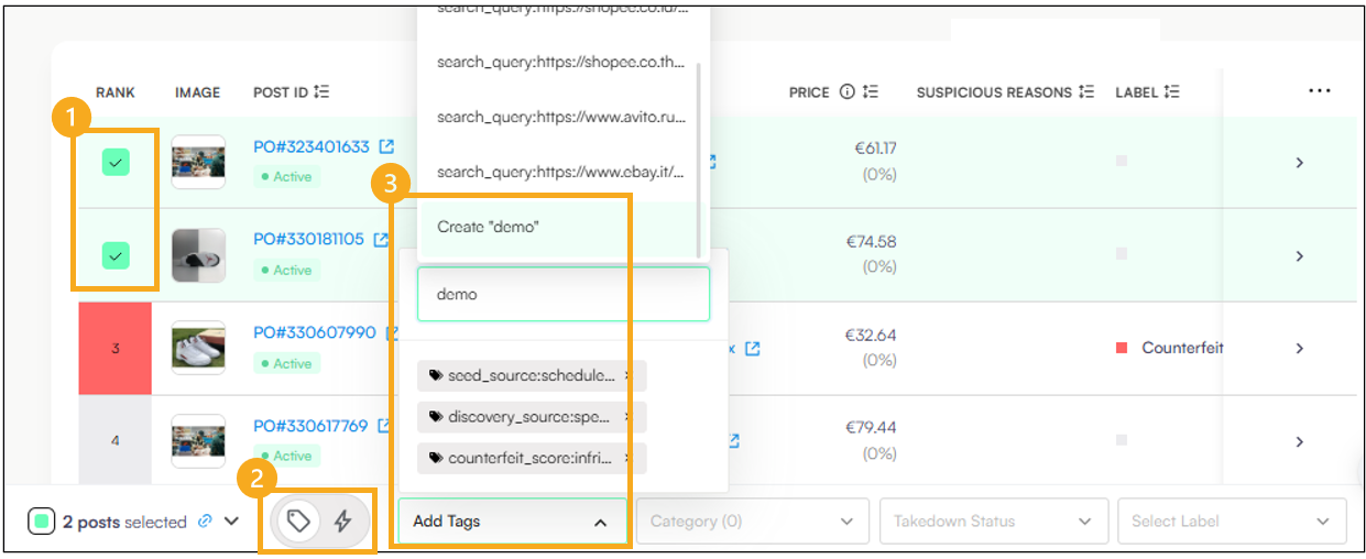Select the Label you want to apply to all the posts OR select specific labels for each post individually (i.e. counterfeit or copyright abuse).