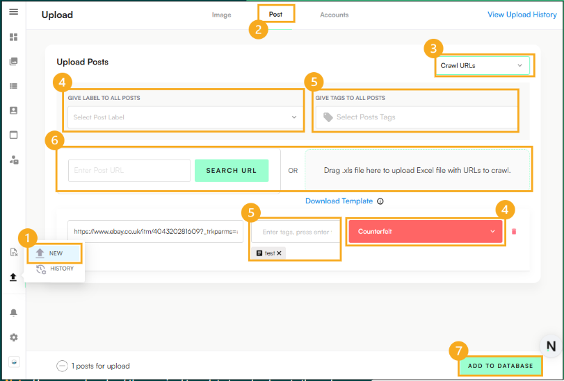 Click “Add to Database” once all posts have been uploaded, tagged and labelled.