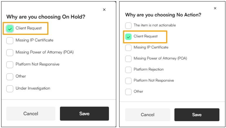 When marking an item as On Hold/No Action, select the following reason when reviewing and click Save:
