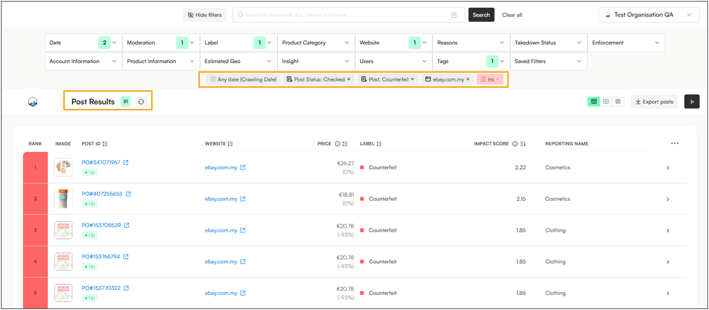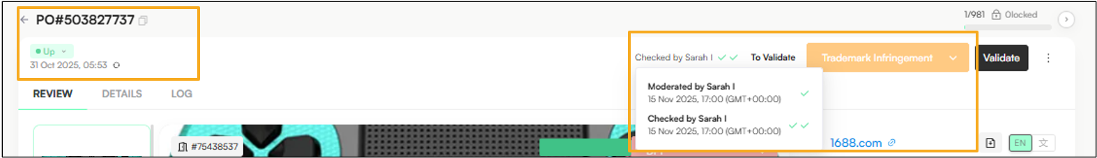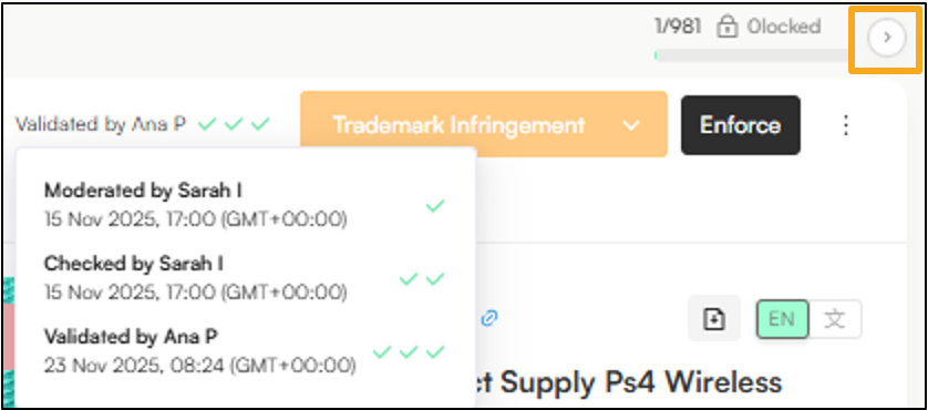 Note: This flags that the post has been reviewed, and is now ready for the enforcement team to proceed with takedown. Once you click Validate, the post will refresh and its workflow status will update—indicating it has now been Moderated, Checked, and Validated.