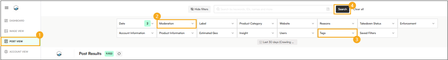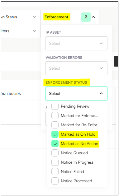 In Post View, you can locate posts marked as On Hold or No Action by using the Enforcement → Enforcement Status filter: